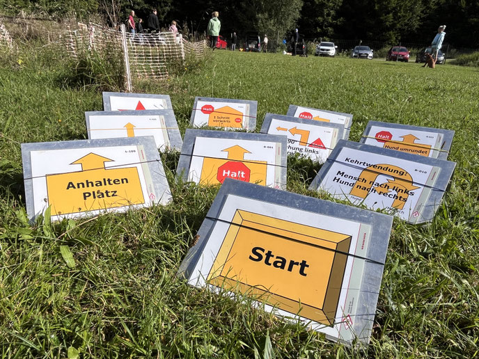 Die Schilder tragen die verschiedenen Symbole, die meist 6m auseinander stehen, so kann der Mensch sich in aller Ruhe auf die nächste Übung vorbereiten. Da wir bis zu 50 Übungen im RO zur Verfügung haben und wir die Parcours nach Belieben aufbauen und variieren können, ist es ausgesprochen abwechslungsreich.